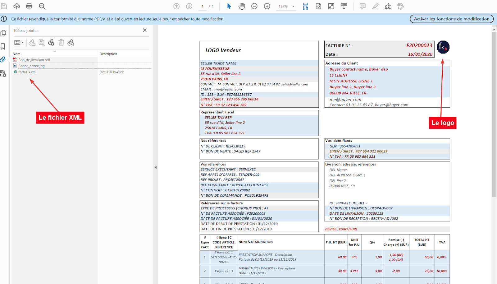 Voici ce que vous obtenez en ouvrant une facture dans ce format avec Acrobat :